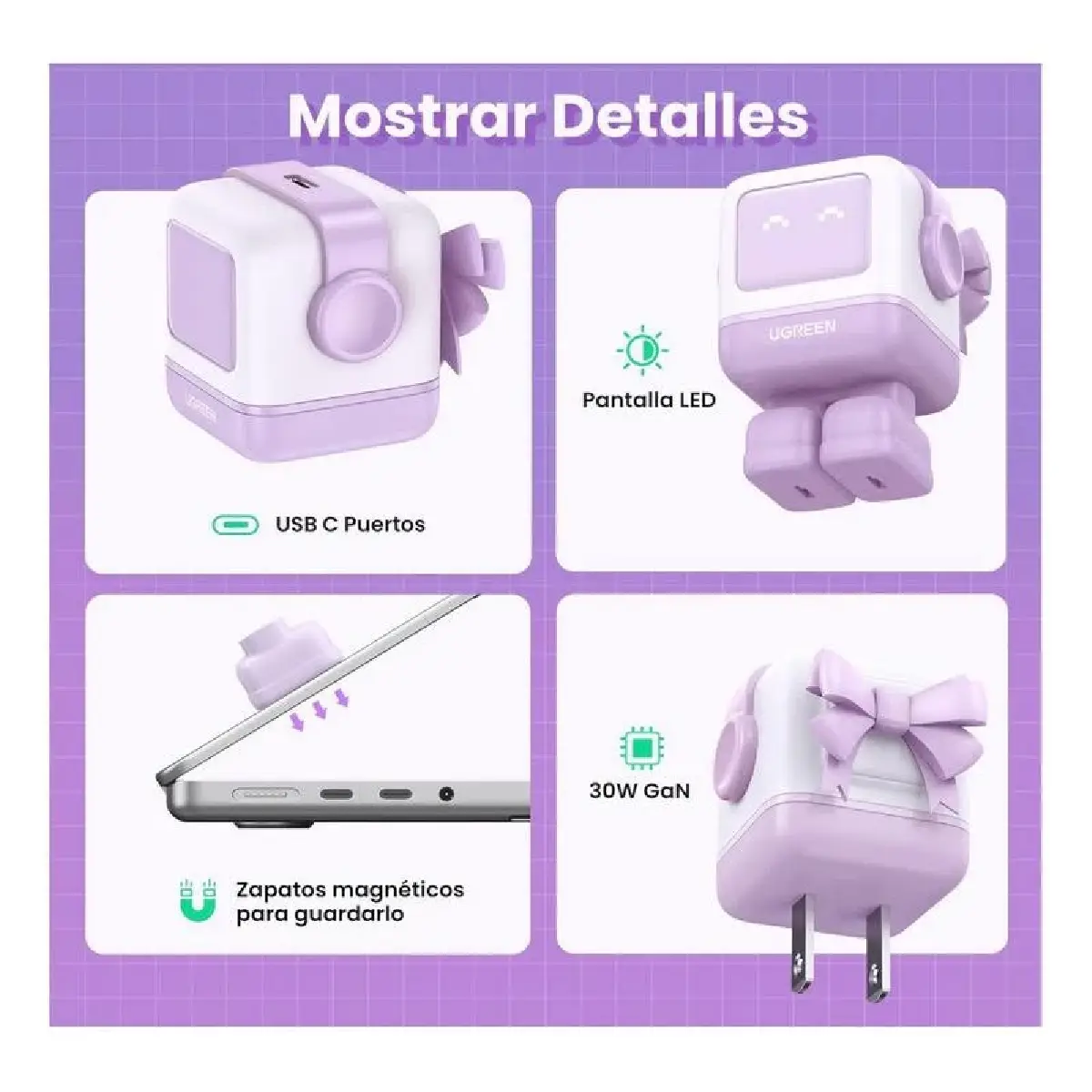 Cargador USB-C Robot GaN de 30W en forma de robot que combina la funcionalidad con lo estético. Es un cargador carga rápida con un puerto USB-C y un sistema de carga de alta eficiencia GanFast que carga en menor tiempo y de una manera más segura contra cortos circuitos y cambios en la temperatura.